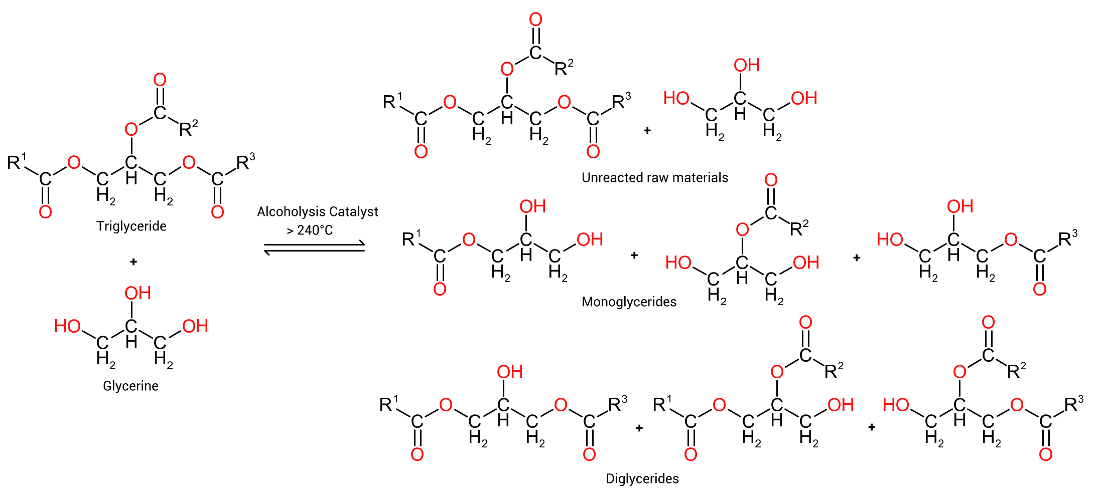 One does not obtain 'pure monoglyceride' as some suspect. The ratios of products produced is dependent on the glycol used, the reaction temperature, dwell time and catalyst used.