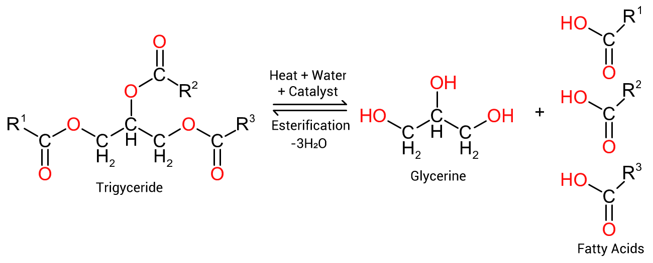 The interrelationship between a triglyceride and the associated fatty acids (marked R¹, R² and R³) is indicated in Figure 1, to the right. Heating a triglyceride in the presence of water and a catalyst will hydrolyse the oil into its component parts, glycerine and associated fatty acids. Conversely, reacting 3 molecules of fatty acids with 1 molecule of glycerine, and removing the water of reaction, will revert to the original triglyceride.